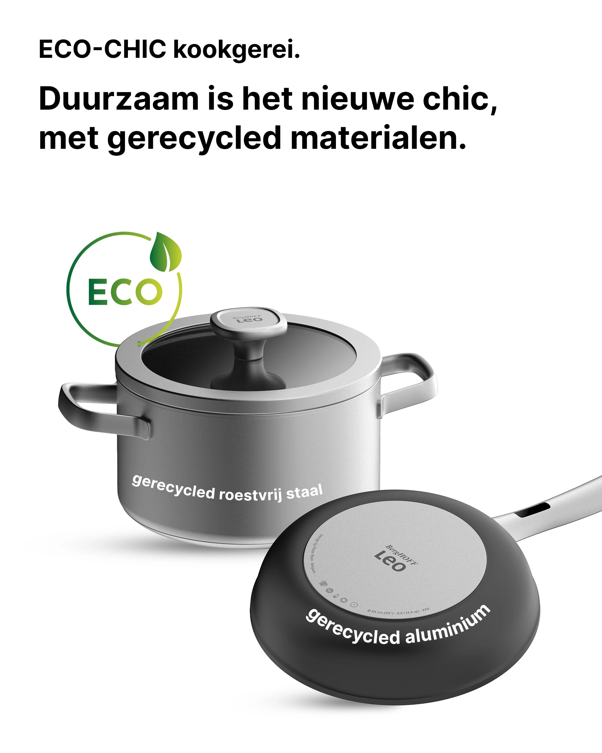 Gemaakt van gerecycled aluminium en roestvrij staal, combineert dit kookgerei stijl met duurzaamheid. De hoogwaardige materialen behouden dezelfde warmtegeleiding en sterkte als nieuw, maar met een veel kleinere ecologische voetafdruk. Kies voor ECO-CHIC en ervaar hoe duurzaamheid en design naadloos samengaan, zonder concessies aan kwaliteit en prestaties.
